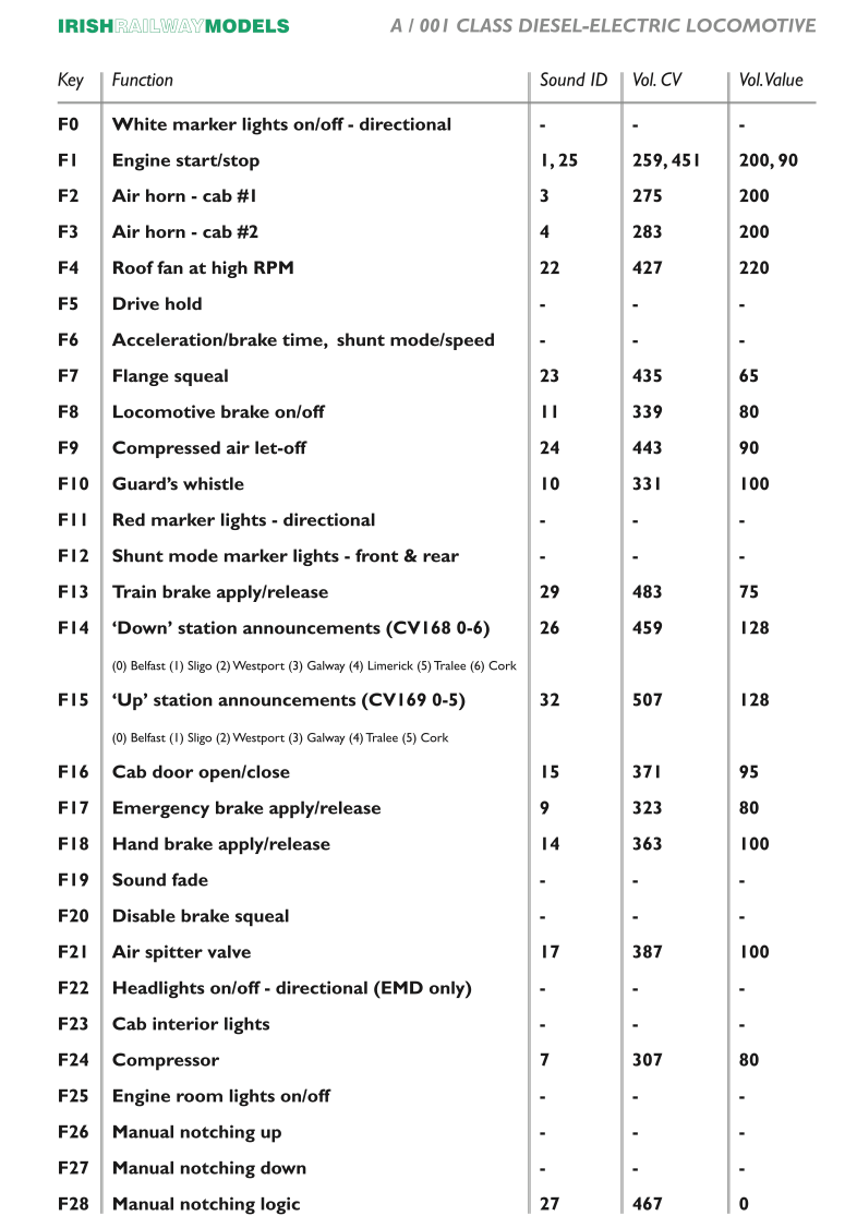 Deartha go sonrach do innill Aicme Múnlaí Iarnróid na hÉireann, oibríonn an díchódóir seo gan uaim leis an soilsiú ar bord, córas fanacht beo PowerPack agus cumraíocht dé-chainteoir chun sainghné agus feidhm rang A inneall Crossley ag an obair a atáirgeadh.