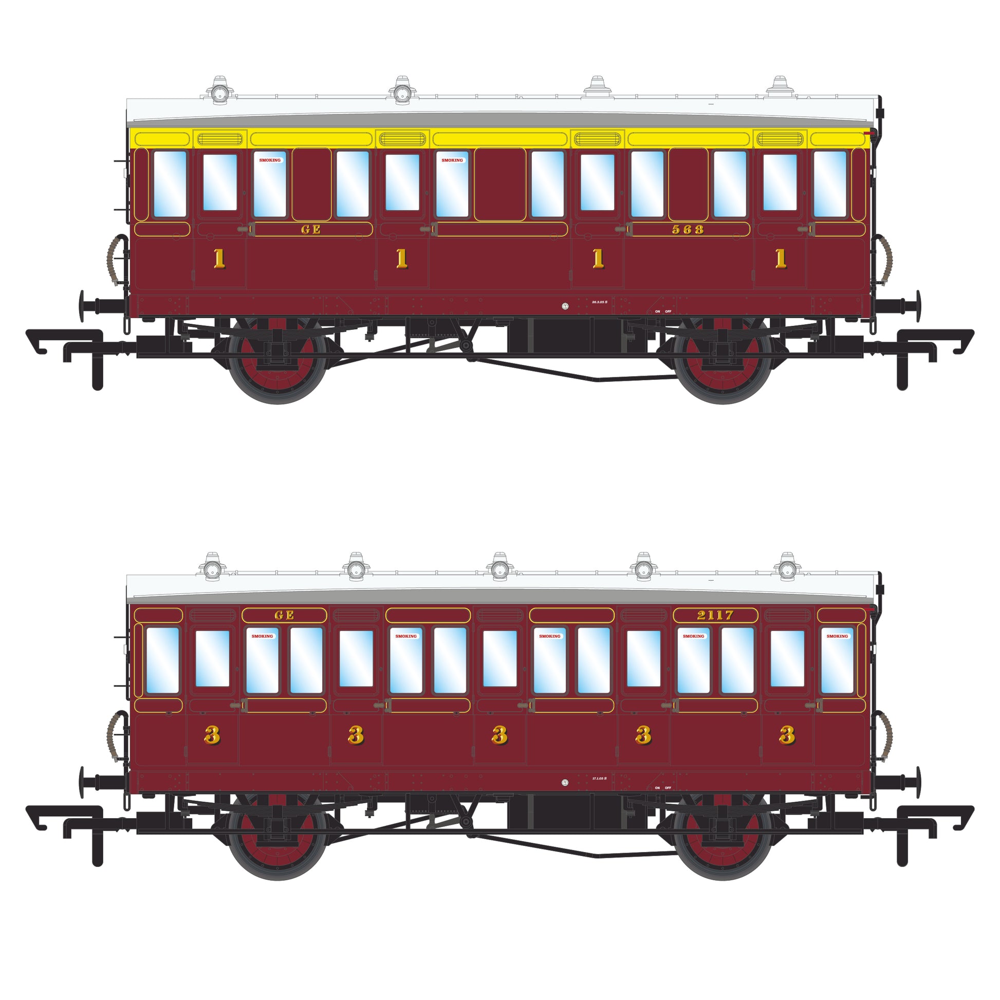 Rinneadh na múnlaí coirp a léiriú i gcrème nó i líneáil primrós, agus glacadh le stíl litreacha le séirif nua, chomh maith le huimhreacha beaga ranganna ar phainéil na ndoirse más féidir. Mar stoc bruachbhailte, ní raibh feiste armúrtha GER ar na caibinéid seo. Ina ionad sin, léiríodh caibinéid chéad agus dara rang trí bhannaí dathanna leathan a chur faoi na himill—buí cróim don chéad rang agus gorm Fraincise don dara rang.